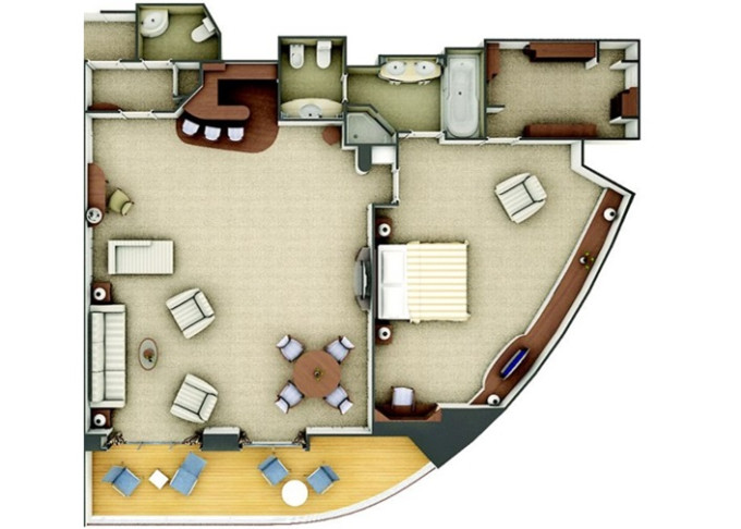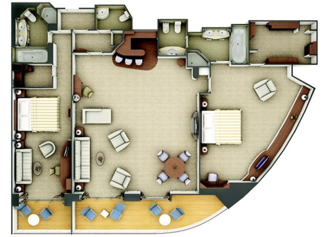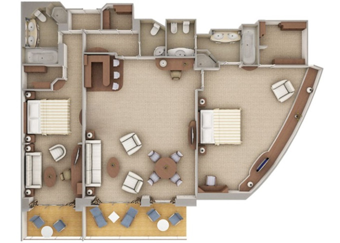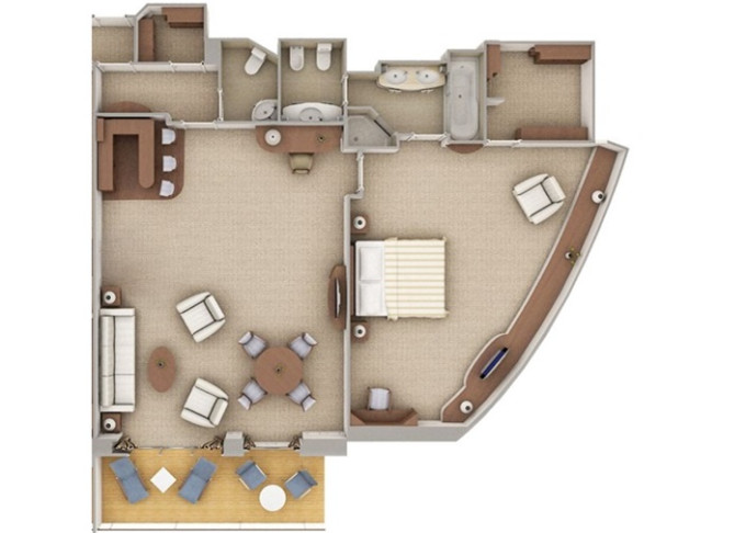 O2 - Owner's Suite 2 117 m² (vrátane balkóna 20 m²). Owners Suite O1 spojená s Vista Suite. 7. paluba stred. Max 5 osôb. 47 600 € 23 800 € za osobu