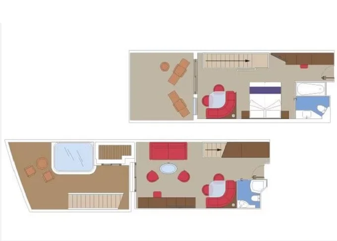 | YJD - Yacht Club Duplex Suite s vírivkou 46 m² + balkón 30 m². Vírivka. 2 podlažia, šatník, 2 kúpeľne (1 s vaňou). Max 4 osoby. 16. paluba. Cenový model MSC Yacht Club. | 10 230 € 10 230 € za osobu | ||