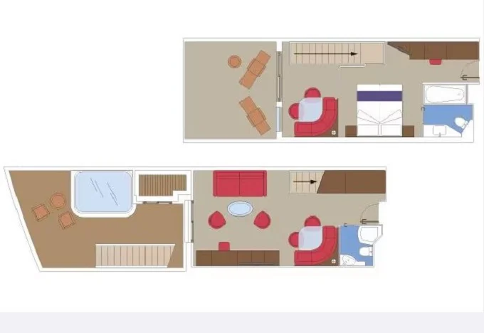 | YJD - Yacht Club Duplex Suite s vírivkou 46 m² + balkón 30 m². Vírivka. 2 podlažia, šatník, 2 kúpeľne (1 s vaňou). Max 4 osoby. 16. paluba. Cenový model MSC Yacht Club. Easy package v cene | 9 570 € 9 570 € za osobu | ||